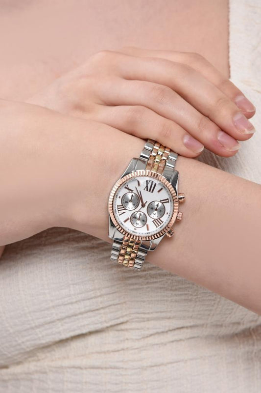 Silver Rose Gold Women's Wristwatch with Roman Numeral Case Detail